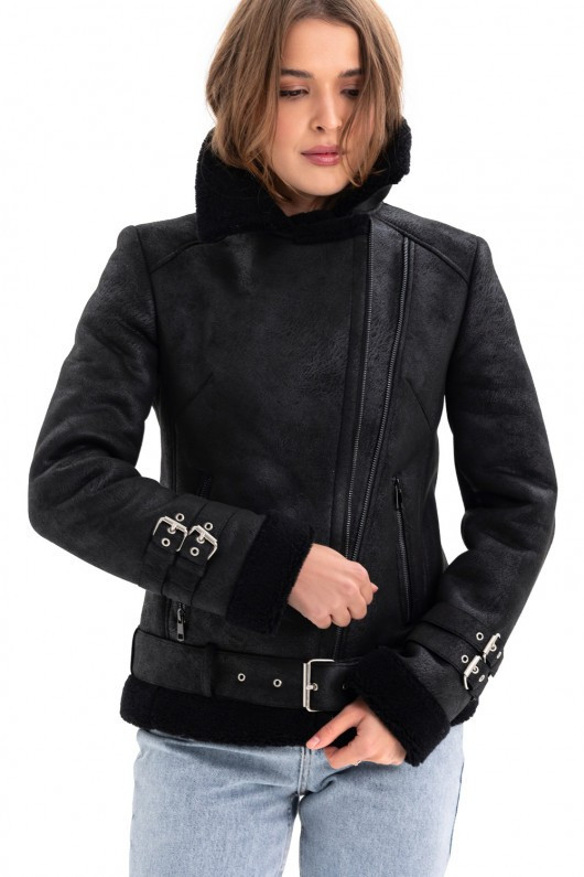 - стильна коротка чорна дублянка косуха з чорним хутром з металевими блискавками зі штучної шкіри дубляж мутон