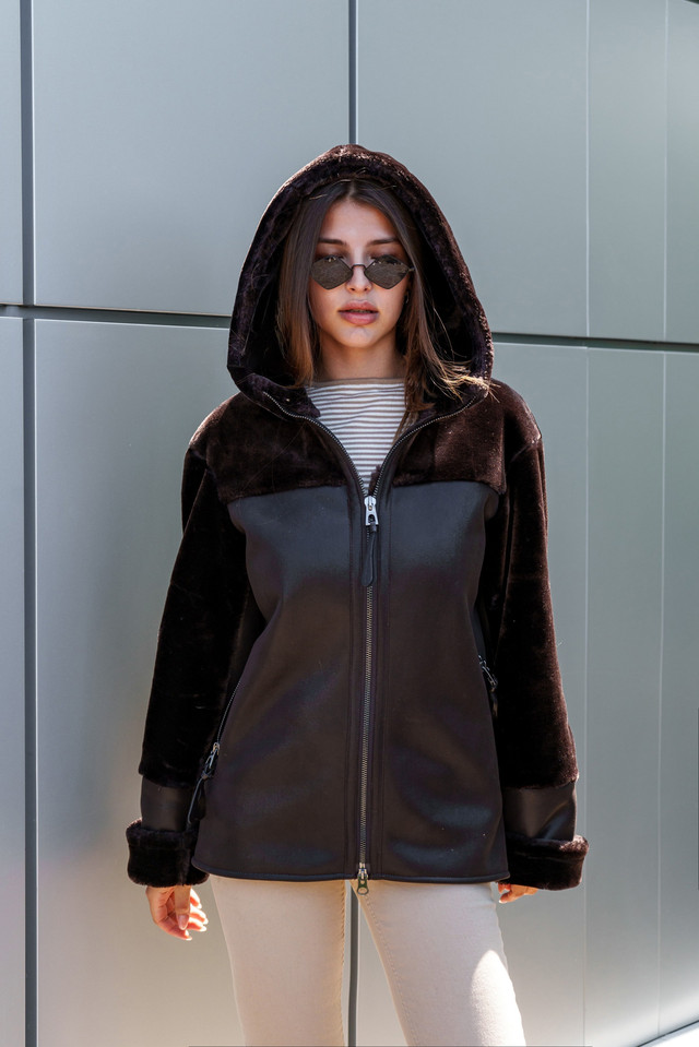 Ще одна модель дублянки, яка заслуговує на увагу модниць з нової колекції 2024: стильна оверсайз комбінована дублянка з дубляжу мутон та еко-замші з вшитим розкішним капюшоном та цікавими накладними кишенями.
