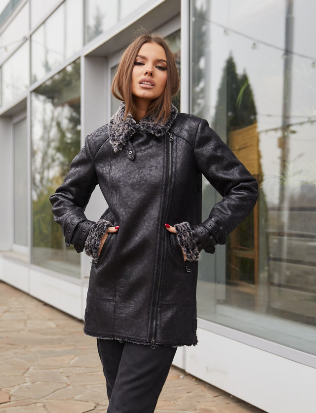 - чорна дублянка косуха автоледі приталеного фасону на косу блискавку