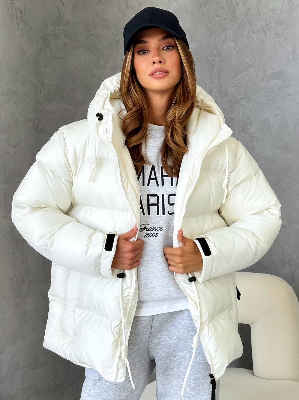 Куртка пуфер жіноча зимова оверсайз на затяжку молочна