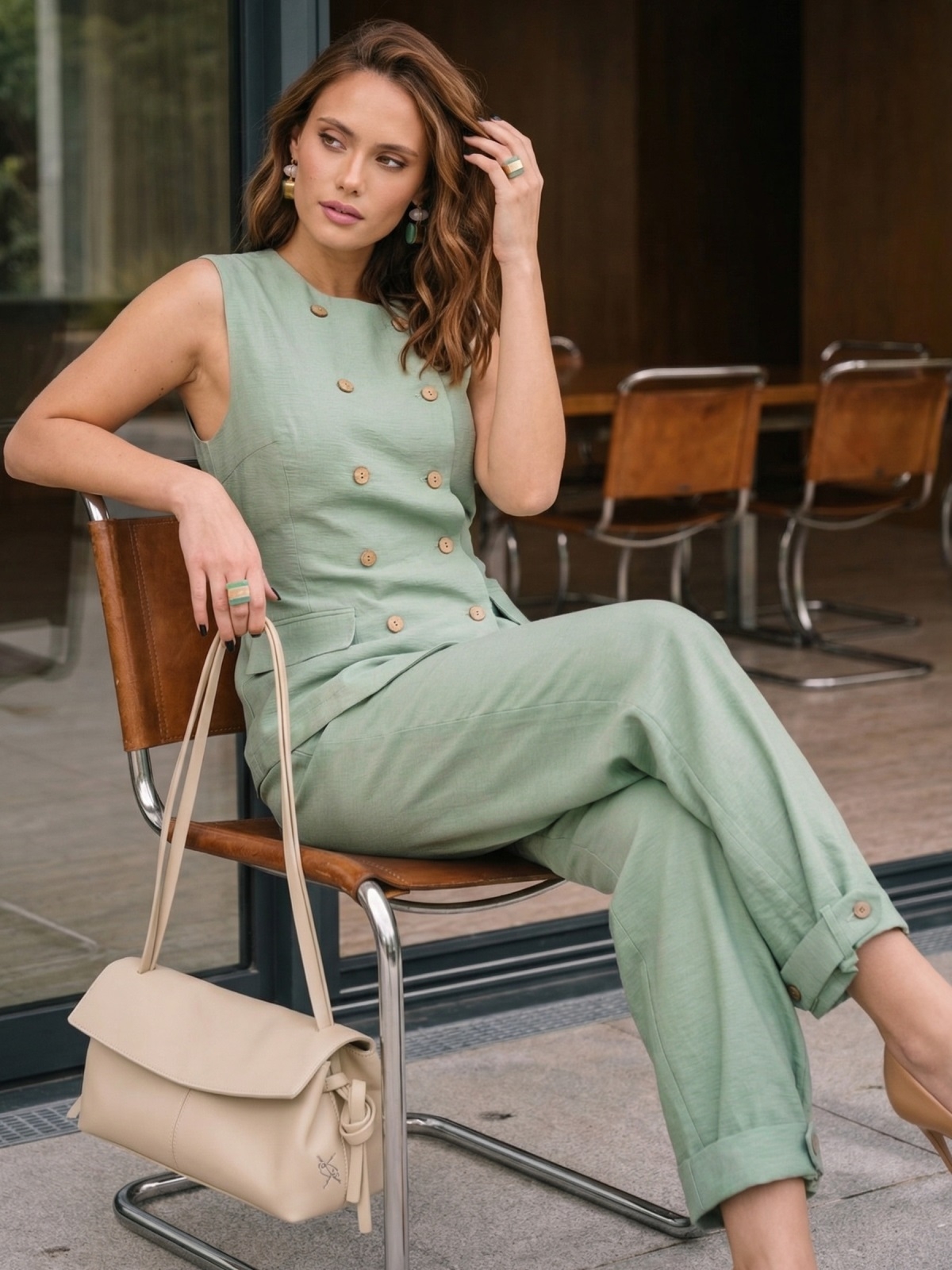 -21%Стильний літній брючний костюм жіночий лляний двубортний вільного крою м’ятний