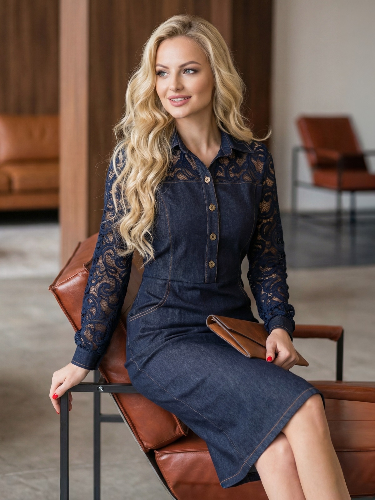 Сукня з деніму. Рукава і кокетка декоровані витонченим мереживом в тон основної тканини. На планці розташовані функціональні ґудзики. Застібається на приховану блискавку на спинці.